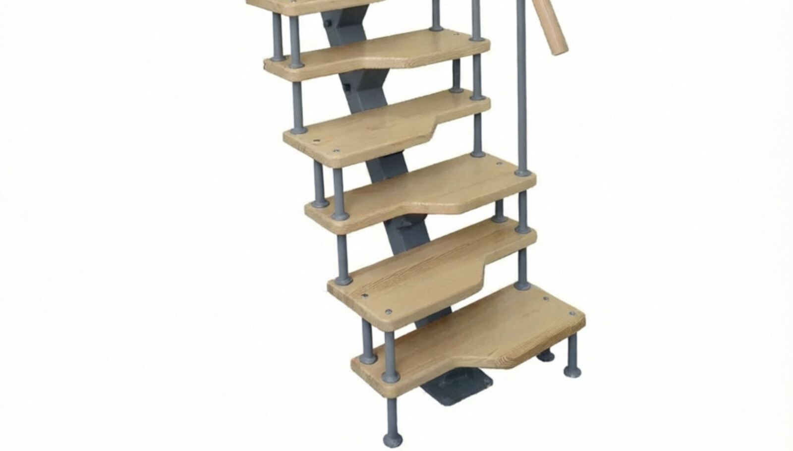 Монокосоурная конструкция представляет собой единственный несущий элемент, расположенный по центру лестницы. Это позволяет сократить ширину конструкции до 600-800 мм, что на 30% меньше по сравнению с традиционными двухкосоурными аналогами. Каркас изготавливается из профильной трубы с антикоррозийным покрытием (оцинковка или порошковая покраска), что обеспечивает долговечность и устойчивость к нагрузкам до 250 кг на ступень.