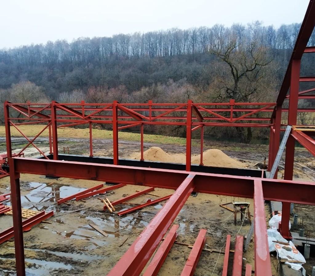 Каркас здания загородного ресторана в Луховицах, Московская область. Мы занимались как изготовлением, так и монтажом элементов металлокарса здания. Балки выполнены из тяжелого двутавра, из него же выполнены и несущие элементы кровли. За счет большого поперечного сечения кровельных балок удалось частично отказаться от ферм, что удешевило изготовление и облегчило монтаж.